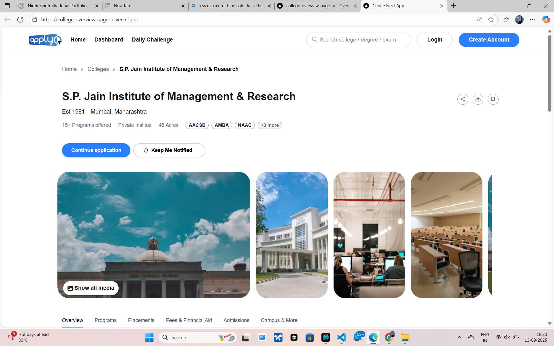 Tech Stack: Next.js, Tailwind CSS Overview: This project is a modular, responsive college overview dashboard designed for the Applyo platform. It provides prospective students with a centralized interface to explore detailed information about top institutions like SPJIMR, including programs, placements, fees, campus life, and more.. Built with a mobile-first approach, the layout emphasizes clarity, accessibility, and bilingual readiness. Tailwind CSS ensures consistent styling and rapid prototyping, while Next.js powers fast routing and dynamic content rendering.