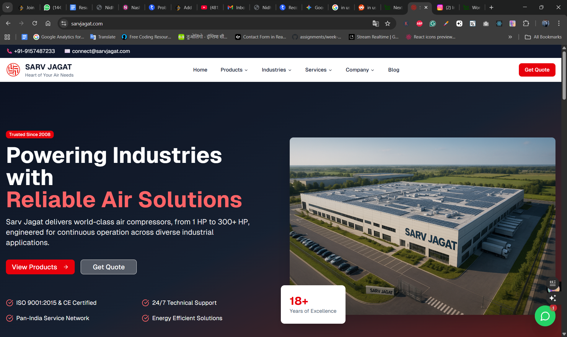 Tech Stack: React, Next.js, TailwindCSS Developed the Sarv Jagat Corporation website to showcase industrial air compressor solutions across diverse sectors. Built using HTML, CSS, and JavaScript with responsive design principles for optimal performance across devices. Structured content to highlight product categories, industries served, and service offerings with clear CTAs. Focused on clarity, accessibility, and SEO-friendly layout to support lead generation and brand credibility.