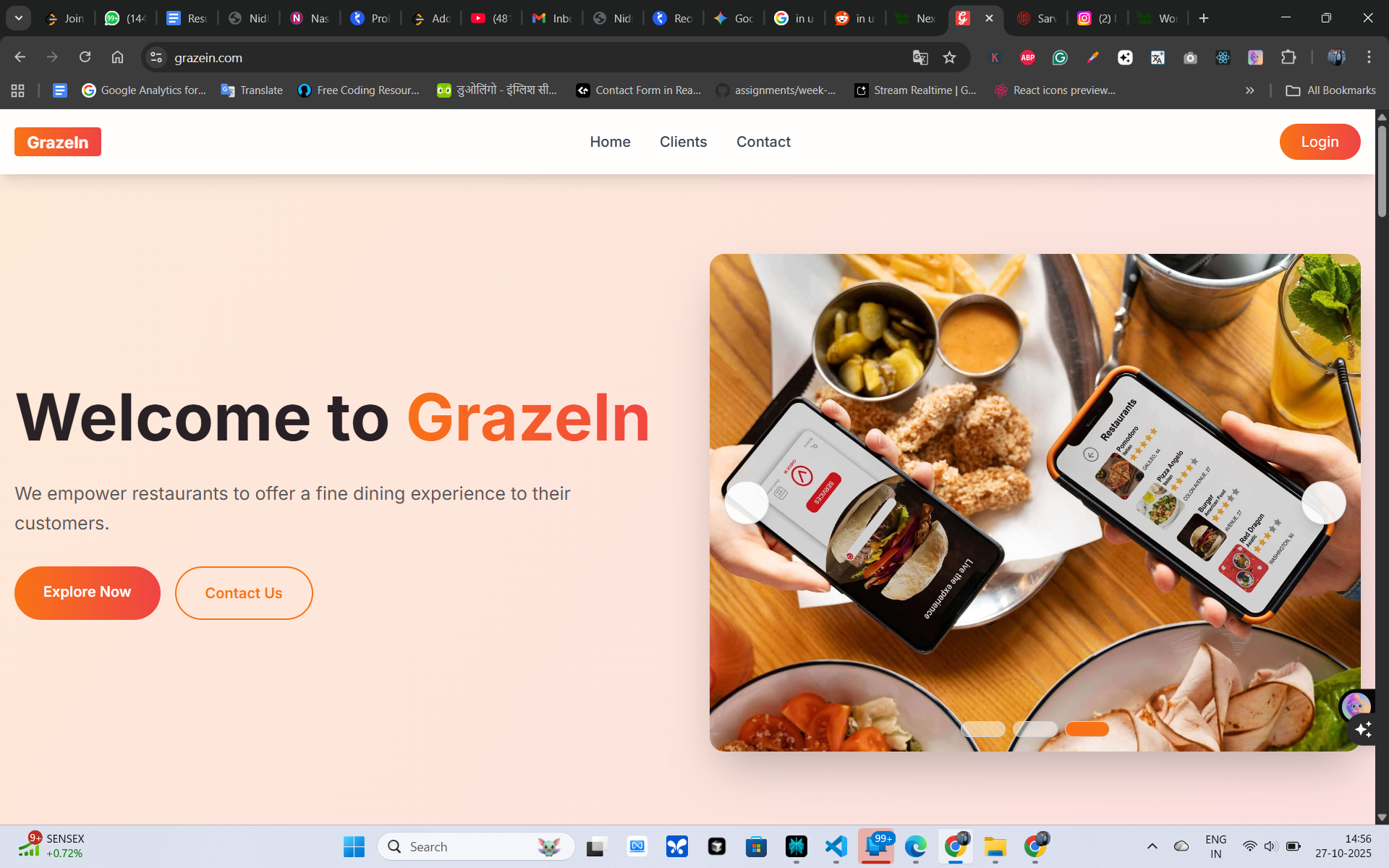 Tech Stack: React, Next.js, TailwindCSS Developed GrazeIn, a digital dining platform for restaurants using React, Next.js, TailwindCSS, and Vite. Implemented QR-based menu access, real-time updates, and multilingual support for enhanced customer experience. Designed responsive UI and streamlined ordering, payment, and communication workflows. Focused on accessibility, cost-efficiency, and data-driven insights to empower restaurant operations.
