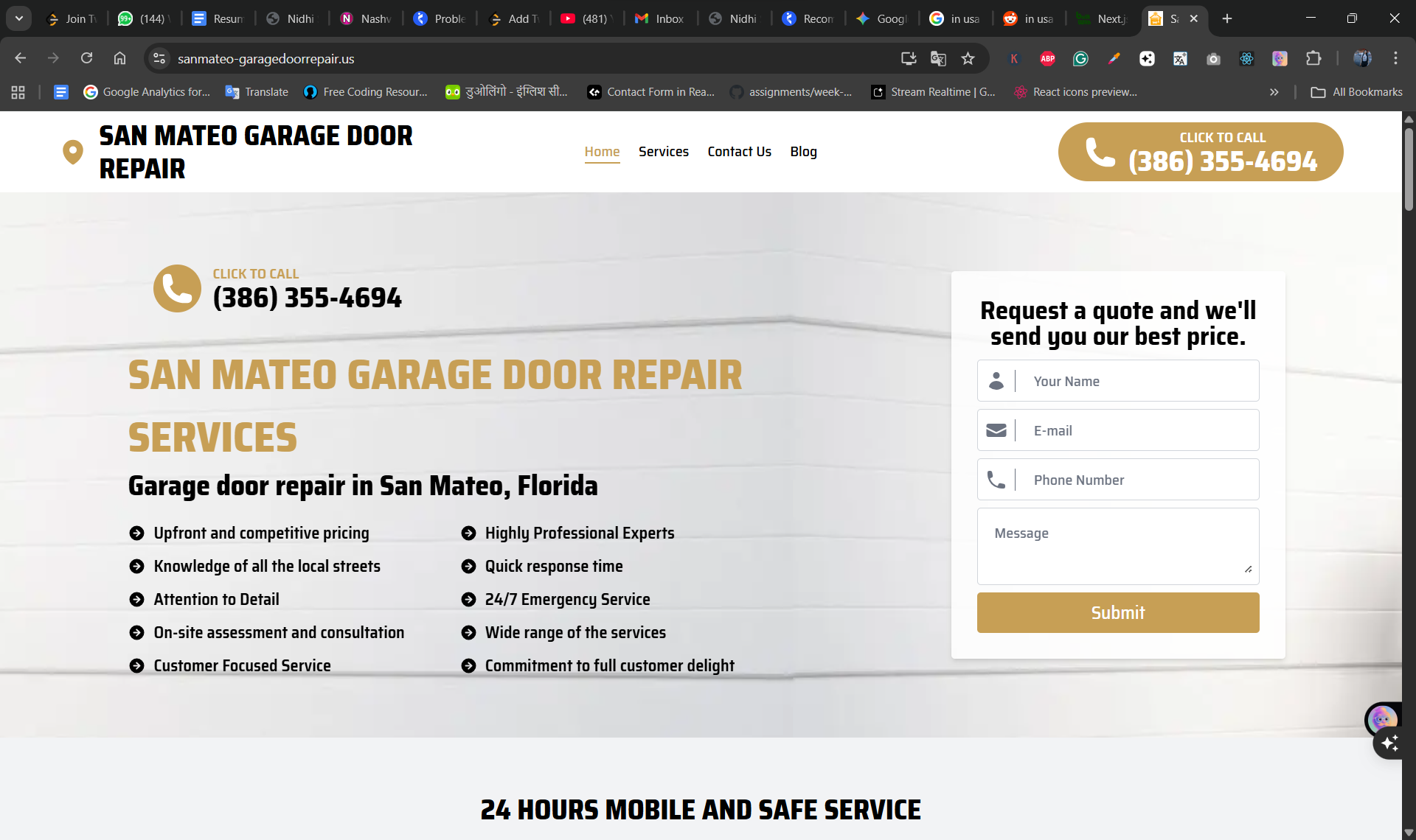 Tech Stack: React, Next.js, TailwindCSS Developed a responsive garage door repair service website using Next.js and TailwindCSS, optimized for local SEO and mobile accessibility. Implemented a clean UI with intuitive navigation and integrated a contact form for lead generation. Focused on fast load times, emergency service visibility, and user trust through testimonials and service highlights. Designed and deployed the site with attention to detail, ensuring 24/7 accessibility and clear service offerings.