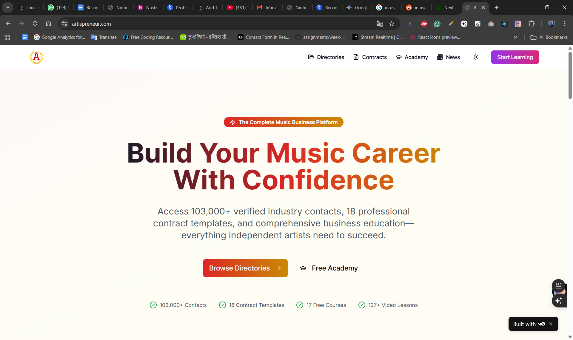 Tech Stack: React, Next.js, TailwindCSS. Developed Artispreneur, a full-stack web platform for independent musicians, offering industry directories, contract templates, and business courses. Built using Next.js, Tailwind CSS, and Vercel for fast, responsive, and scalable deployment. Integrated dynamic content modules and secure digital downloads for instant access to 100K+ verified contacts. Designed with a user-first approach, ensuring seamless navigation, accessibility, and mobile responsiveness.