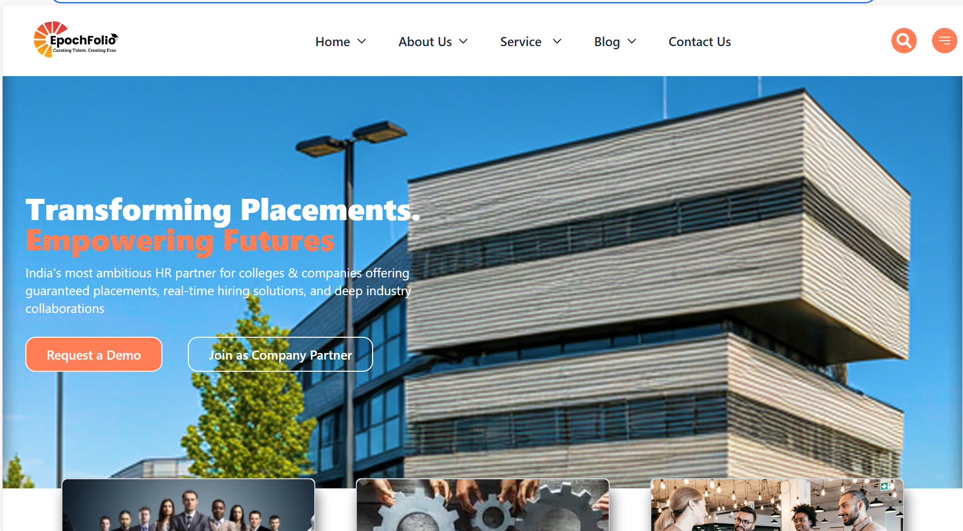 Tech Stack: React & Tailwind CSS. Overview: EpochFolio is a comprehensive HR-tech platform designed to streamline campus placements for colleges and hiring processes for companies. It bridges the gap between academia and industry through guaranteed placements, real-time hiring tools, and deep institutional partnerships.