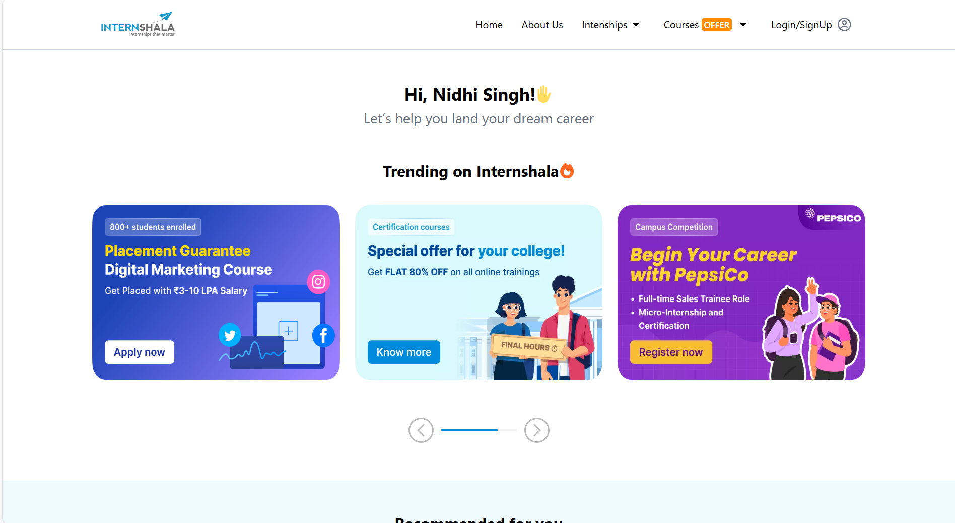 Tech Stack: React, Tailwind CSS, Vite Overview: This project is a responsive internship discovery portal designed to help students and job seekers explore curated opportunities across domains like Full Stack Development, AI, UI/UX, and more. It mimics real-world platforms like Internshala, offering a clean, modular layout with dynamic listings and personalized recommendations.